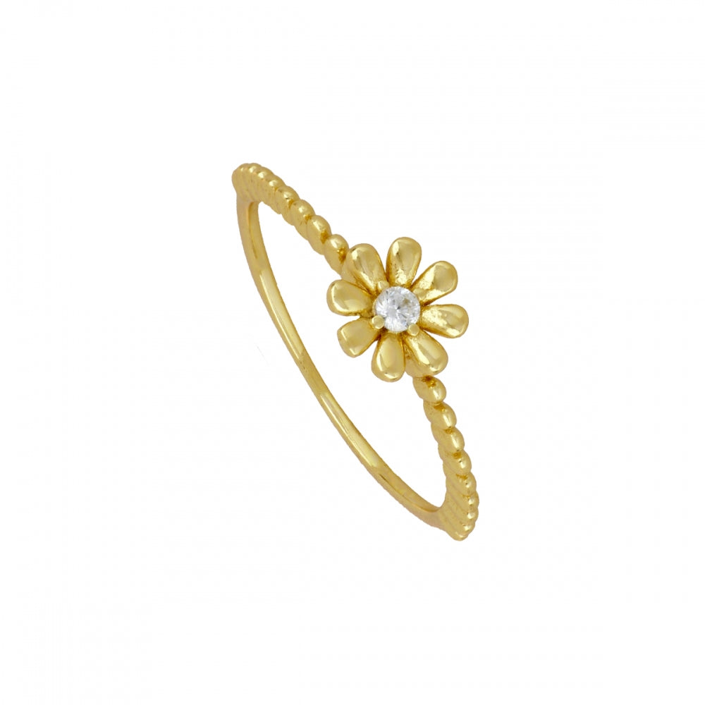 Anel delicado com design de flor e um brilhante zircão branco ao centro. O aro com microesferas adiciona um charme extra à peça. Disponível em prata 925 banhada a ouro, esta joia charmosa é perfeita para mulheres que apreciam detalhes delicados e atemporais. Tamanho da flor: 6,3 mm.