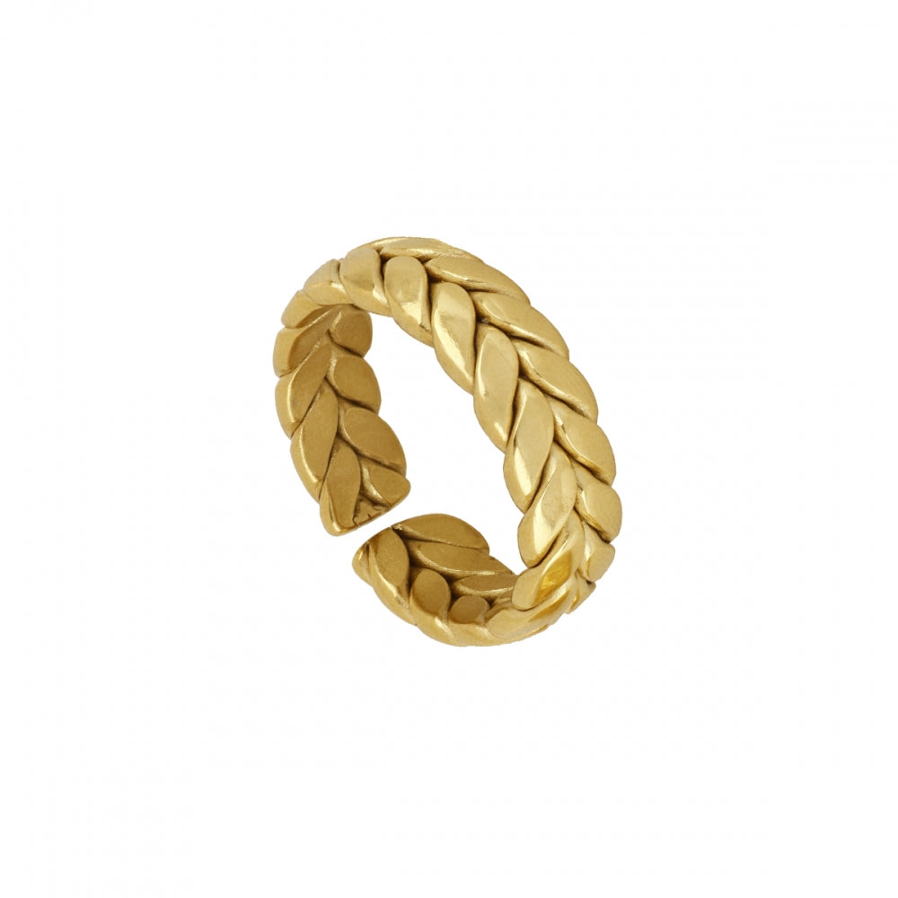 Anel aberto com design inspirado em folhas de louro, símbolo de vitória, honra e prosperidade. Confeccionado em aço inoxidável 316, conhecido por sua alta resistência e durabilidade, acabamento em aço dourado.