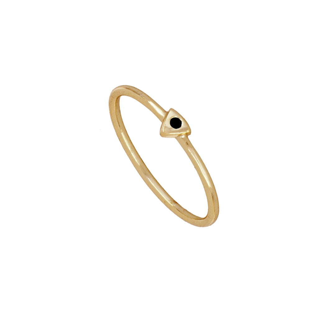 Anel moderno com design de triângulos e zircões pretos, disponível em prata 925 banhada a ouro 14k. Uma peça elegante e com um toque contemporâneo.