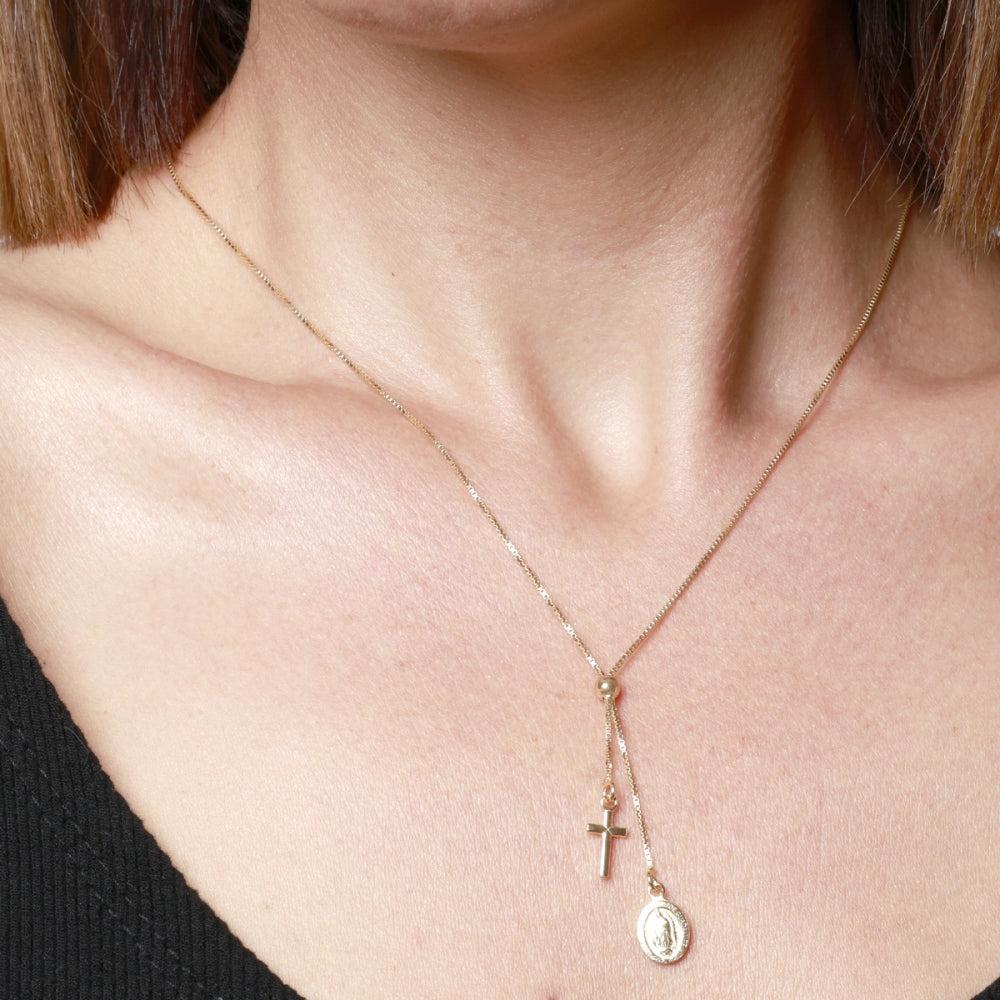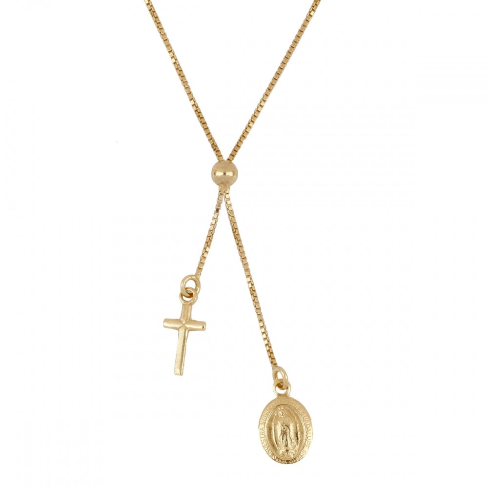 Gargantilha delicada e cheia de significado, disponível em prata 925 banhada a ouro. Apresenta design minimalista com um pingente da Nossa Senhora de Guadalupe e uma cruz, ambos com 4,5cm pendurados. A corrente tem comprimento de 45cm, proporcionando um caimento elegante e ajustado. Ideal para quem deseja carregar proteção e espiritualidade no dia a dia.
